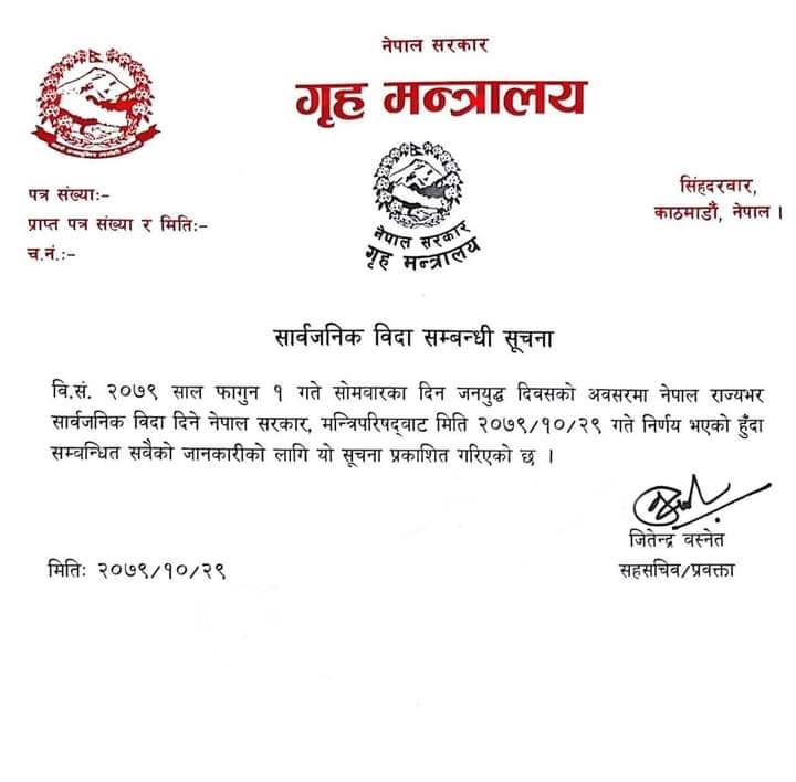 काठमाडौं, २९ माघ– सरकारले जनयुद्ध दिवसमा सार्वजनिक विदा दिने निणर्य गरेको छ । आइतबार दिउँसो प्रधानमन्त्री तथा मन्त्रिपरिषदको कार्यालय सिंहदरबारमा बसेको मन्त्रिपरिषदको बैठकले फागुन १ गते जनयुद्ध दिवसका रूपमा सार्वजनिक विदा दिने निणर्य गरेको हो।