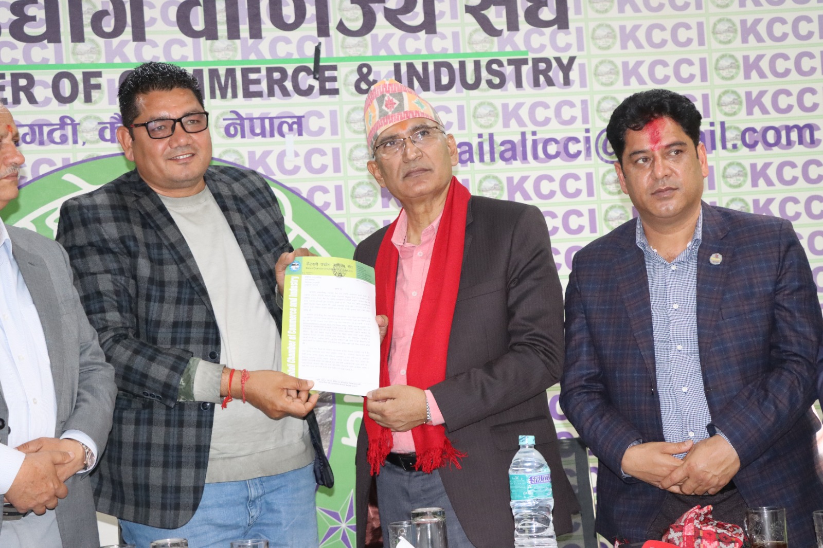 कैलाली उधोग बाणिज्य संघका अध्यक्ष पुस्पराज कुँवरले अर्थमन्त्री बिष्णु पौडेललाई ज्ञापनपत्र बुझाएका हुन् । मन्त्री पौडेललाई स्वागत गर्दै कैलाली उधोग बाणिज्य संघका बरिष्ठ उपाध्यक्ष पुस्कर ओझाले ब्यवसायी निकै संकटमा भएको बताएका थिए ।