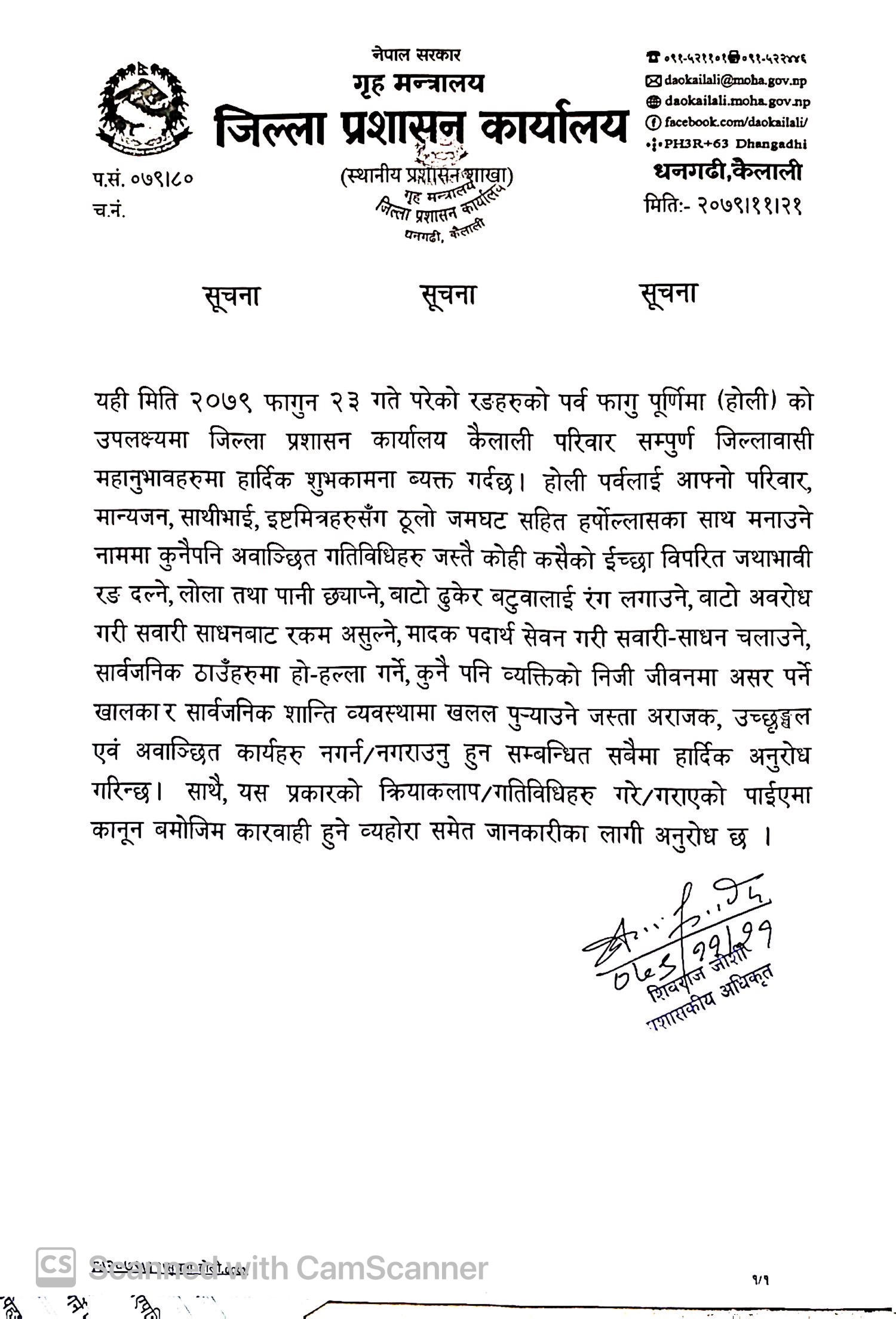 धनगढी- जिल्ला प्रशासन कार्यालय कैलालीले होलीमा जथाभावी रङ दले कारवाही गर्ने जनाएको छ । आइतबार होलीका अवसरमा कोही कसैको ईच्छा विपरित जथाभावी रङ दल्ने, लोला तथा पानी छ्याप्ने, बाटो ढुकेर बटुवालाई रंग लगाउने कार्य गरे कारवाही गरिने प्रशासकीय अधिकृत शिवराज जोशीद्वारा हस्ताक्षरित सूचनामा उल्लेख गरिएको छ ।
