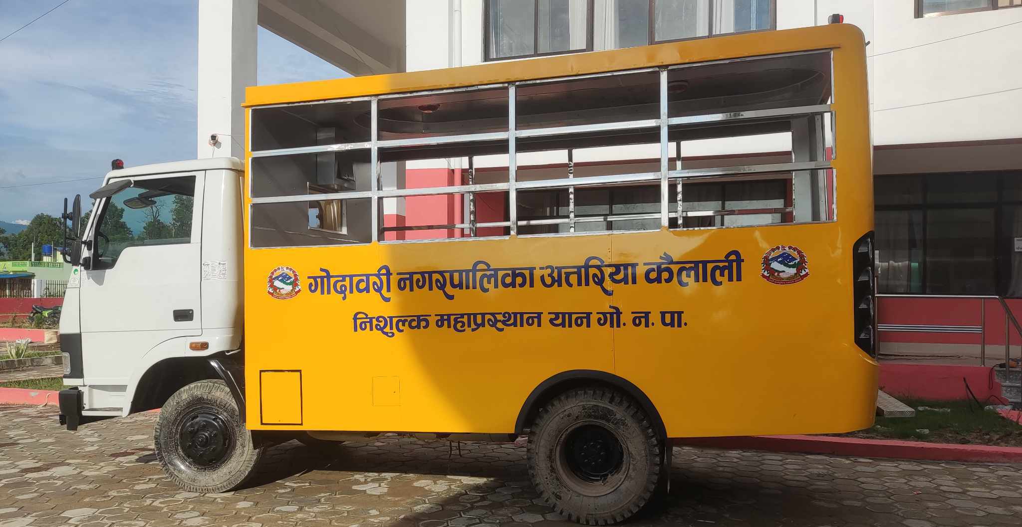 अत्तरिया- कैलालीको गोदावरी नगरपालीकामा निःशुल्क महाप्रस्थान यान संचालनमा आएको छ । बुधबारबाट निःशुल्क महाप्रस्थान यान संचालनमा आएको हो । ३१ लाखको लगानीमा उक्त यान संचालनमा आएको हो ।