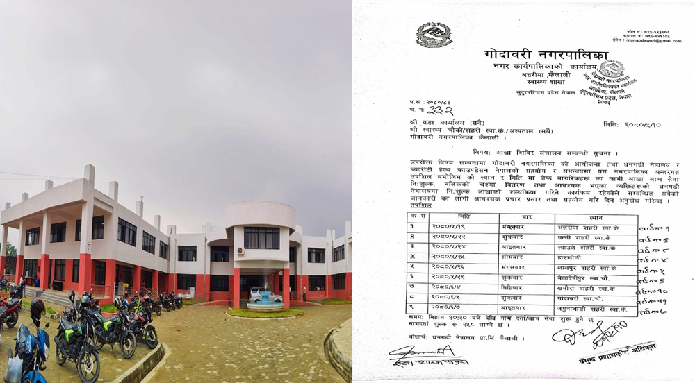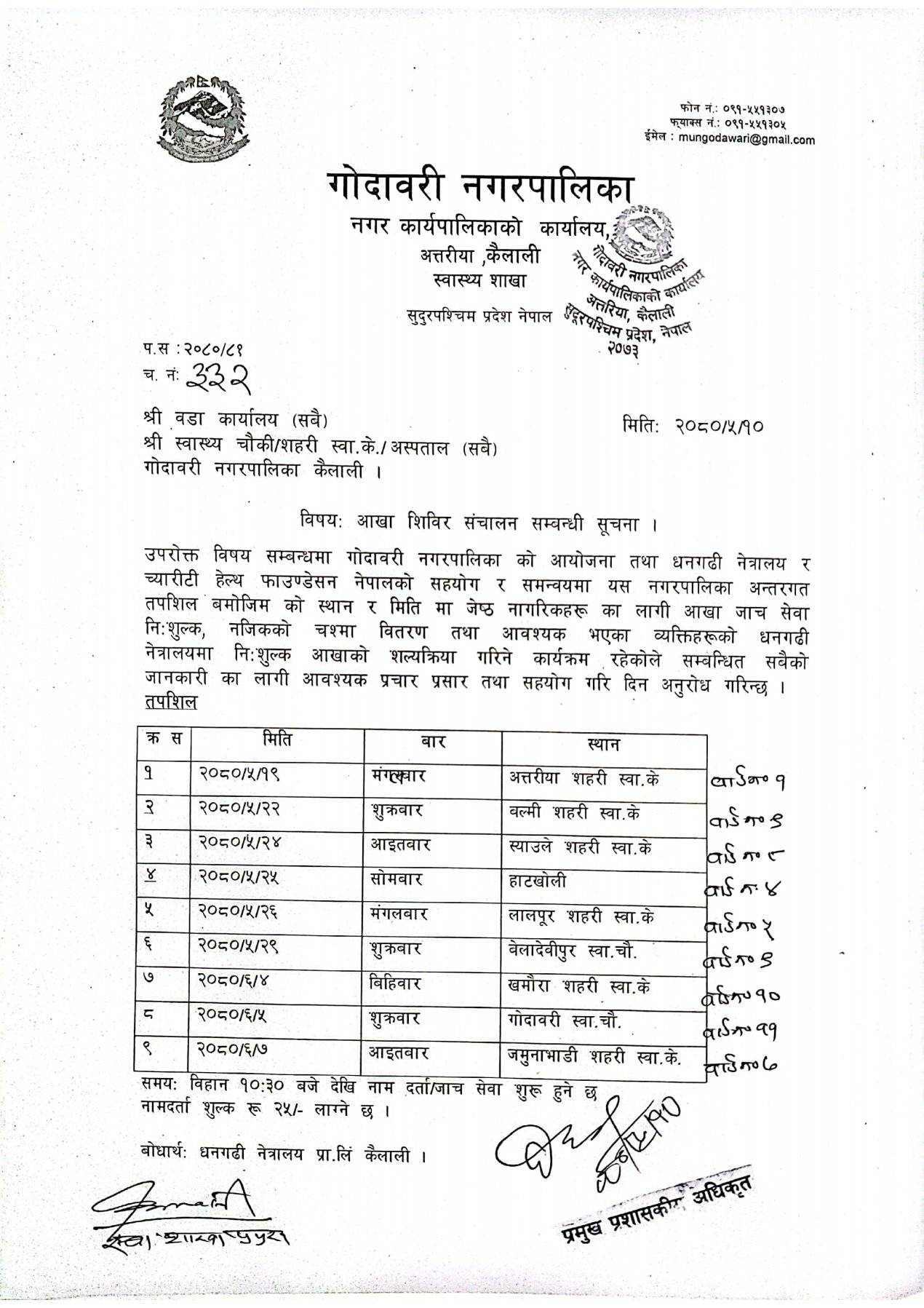 जेष्ठ नागरिकहरुका लागि आखा जाँच सेवा निःशुल्क, नजिकको चश्मा वितरण तथा आवश्यक भएका व्यक्तिहरुको धनगढी नेत्रालयमा निःशुल्क आँखाको शल्यक्रिया गरिने गोदावरी नगरपालिकाद्वारा जारी गरिएको सूचनामा उल्लेख गरिएको छ । आँखा शिविरमा बिहान १०ः३० बजे देखि नाम दर्ता/जाँच सेवा सुरु हुने छ भने नामदर्ता शुल्क रु.२५।- लाग्ने जनाइएको छ ।