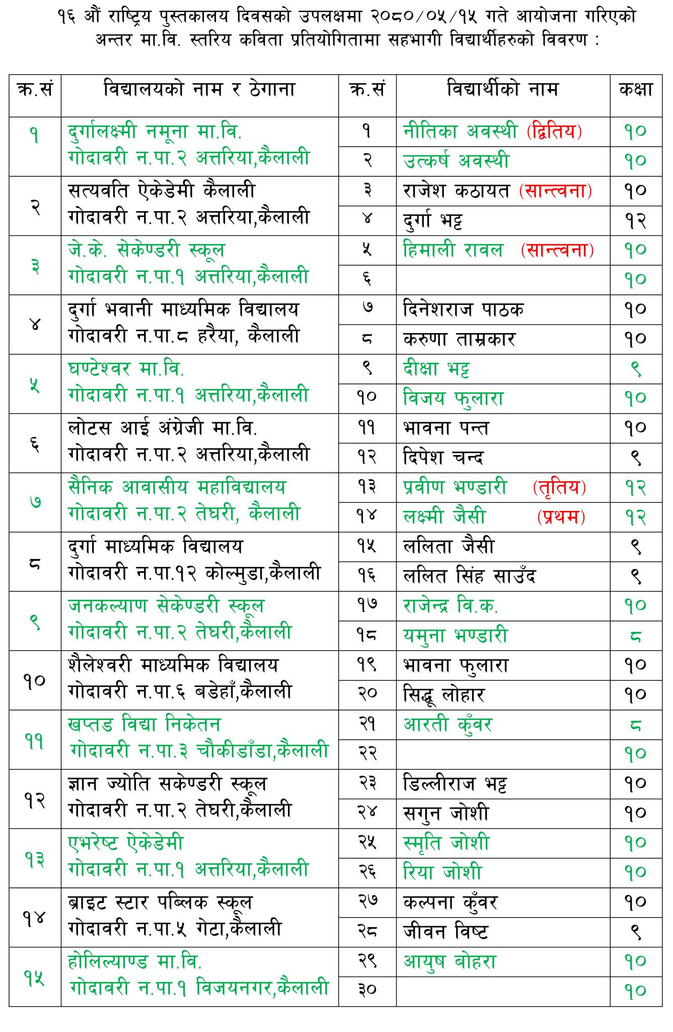 प्रतियोगितामा शैनिक आबासिय महाबिद्यालकायका लक्ष्मी जैशी पहिलो भएका थिए भने दुर्गालक्ष्मी नमुना बिद्यालकायका नितिका अबस्थी दोस्रो भएका थिए । त्यस्तै शैनिक आबासिय महाबिधालय कै प्रबिण भण्डारी तेस्रो भएको थियो भने सान्त्वनामा सत्यवती एकेडेमीका राजेश कठायत र जे.के. सेकेण्डरी स्कुलका हिमाली रावल भएको आयोजकले जनाएको छ ।