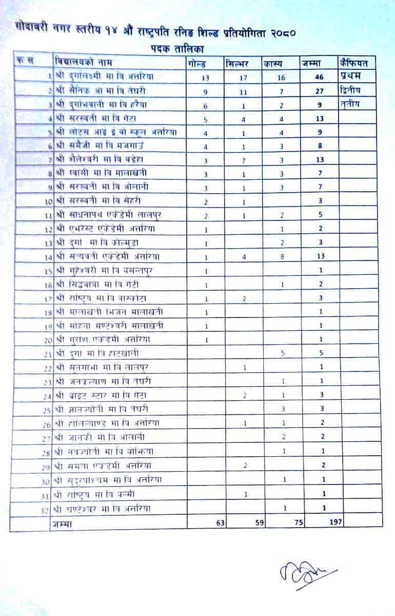 कुन विद्यालयले कुन कुन पदक जिते हेर्नुहोस् :