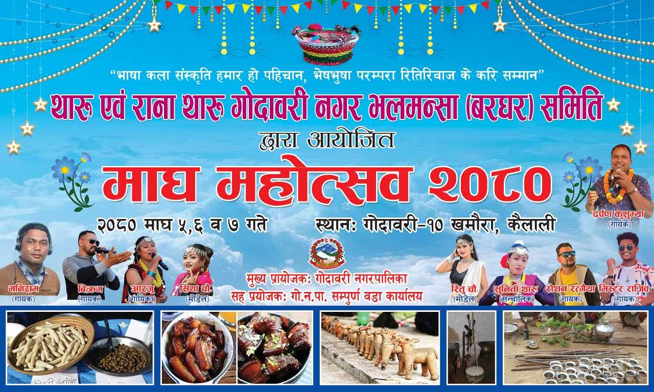 अत्तरिया – कैलालीको गोदावरी नगरपालिका वडा नम्बर १० स्थीत खमौरामा भोलीदेखी माघ महोत्सव सञ्चालन हुने भएको छ । थारु एवंम राना थारु गोदावरी नगर भलमन्सा ( बरघर ) समितिको आयोजनामा माघ महोत्सव सञ्चालन हुने भएको हो ।