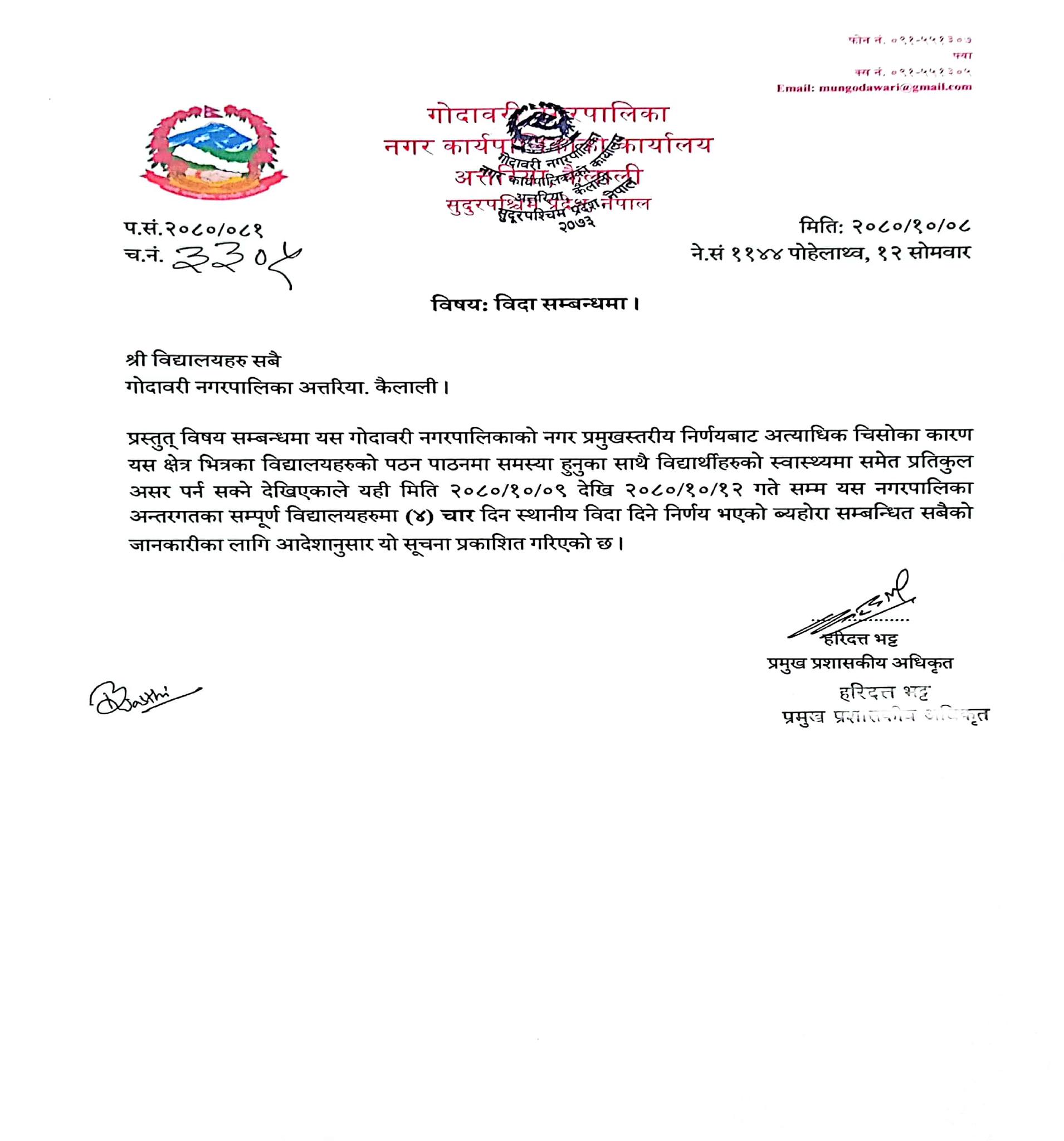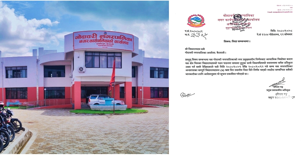 अत्तरिया- कैलालीको गोदावरी नगरपालिकाका विद्यालयमा ४ दिन विदा दिइएको छ । गोदावरी नगरपालिकाको निणर्य अनुसार नगरपालिका अन्तरगतका सम्पूर्ण विद्यालयहरुमा माघ ९ देखि १२ गतेसम्म चिसो बिदा गरिएको गोदावरी नगरपालिका प्रमुख प्रशासकीय अधिकृत हरिदत्त भट्टले बताए ।