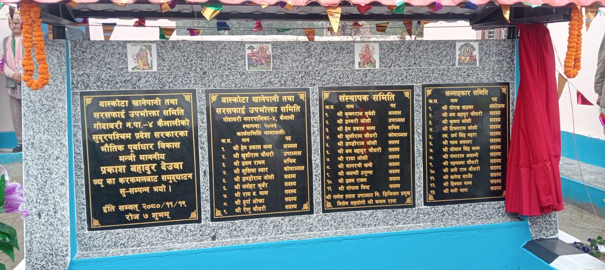 अत्तरिया- गोदावरी नगरपालिका वडा नम्बर ४ को बास्कोटामा नव निर्मित खानेपानी ट्याङ्की हस्तान्तरण गरिएको छ । शनीबार एक कार्यक्रमका बिच खानेपानी डिभीजन कार्यालय धनगढीका निमित्त प्रमुख गणेश प्रसाद उपाध्यायले बिधिवत रुपमा बास्कोटा खानेपानी तथा सरसफाई उपभोत्ता समितिलाई ट्याङ्की हस्तान्तरण गरेको हो ।