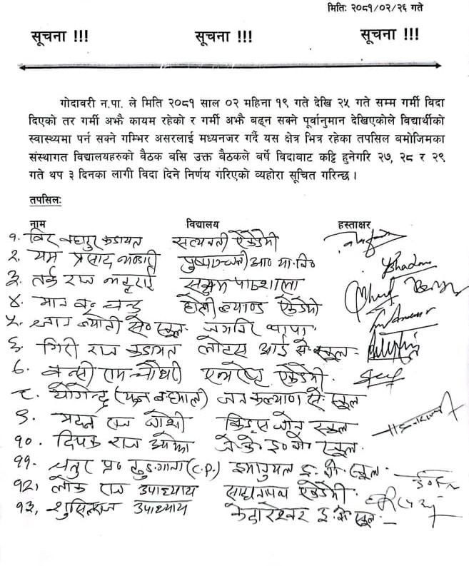 अत्याधिक गर्मी भएसँगै गोदावरीमा थप ३ दिन संस्थागत निजी विद्यालय बिदा