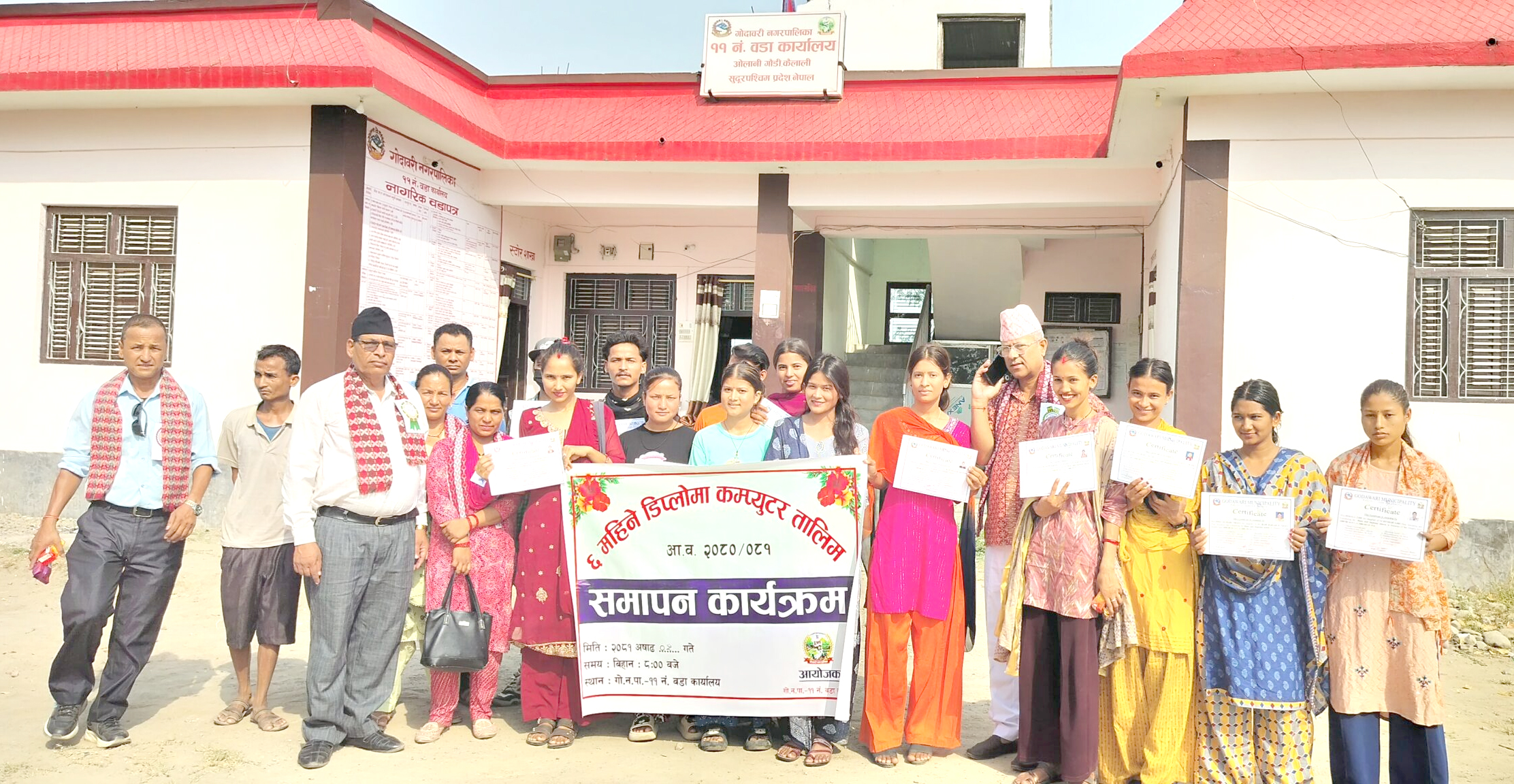 अत्तरिया- कैलालीको गोदावरी नगरपालिका वडा नं ११ ओलानीमा ६ महिने कम्प्युटर तालिम सम्पन्न भएको छ । ग्रामीण क्षेत्रका बेरोजगार युवा तथा महिलाहरूका लागि आयोजना गरेको ६ महिने कम्प्युटर तालिम एक औपचारिक कार्यक्रममा प्रशिक्षार्थीहरूलाई प्रमाण पत्र बितरण गरी  कार्यक्रम सम्पन्न भएको छ ।