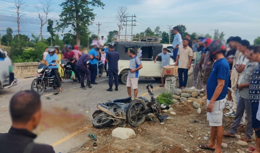 गेटा अस्पताल नजिक म १ ज १६१ नम्बरको म्याजिक र से ६ प ८४२३ नम्बरको मोटरसाईकल एक आपसमा ठोक्किदा दुर्घना भएको हो ।