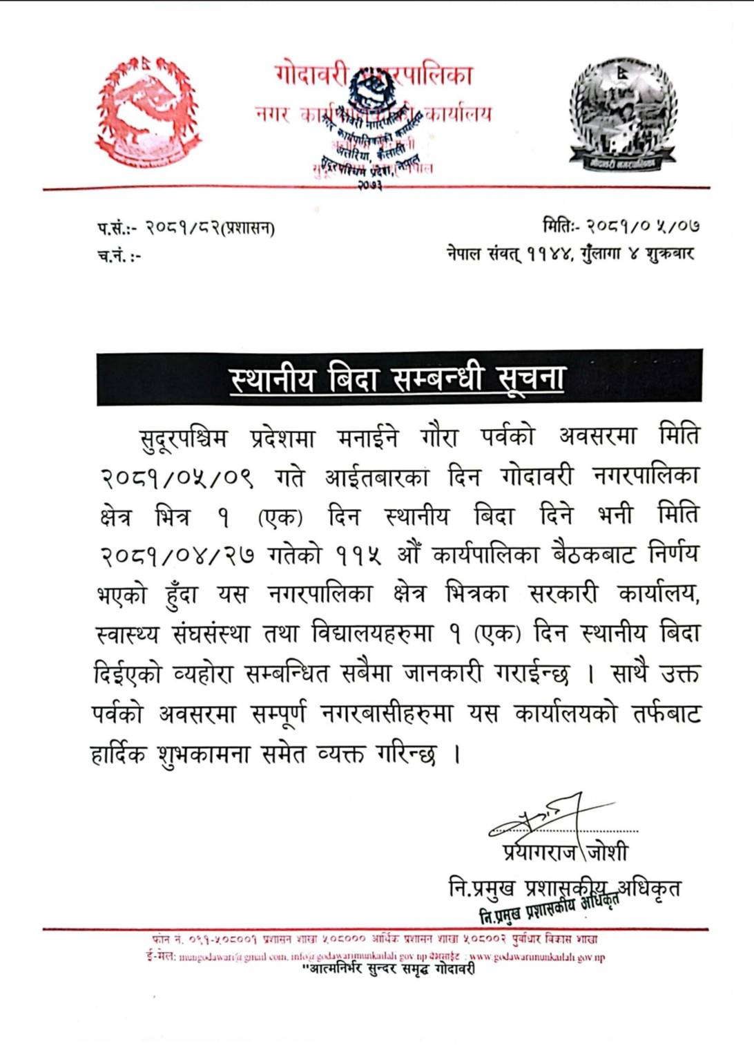 गौरा पर्वको अवसरमा मिति २०८१/०५/०९ गते आइतबारका दिन गोदावरी नगरपालिका क्षेत्र भित्र १ (एक) दिन स्थानीय बिदा दिने भनी मिति २०८१/०४/२७ गतेको ११५ औं कार्यपालिका बैठकबाट निर्णय भएको हुँदा यस नगरपालिका क्षेत्र भित्रका सरकारी कार्यालय, स्वास्थ्य संघसंस्था तथा विद्यालयहरूमा १ (एक) दिन स्थानीय बिदा दिइएको विज्ञप्तिमा उल्लेख गरेको छ ।
