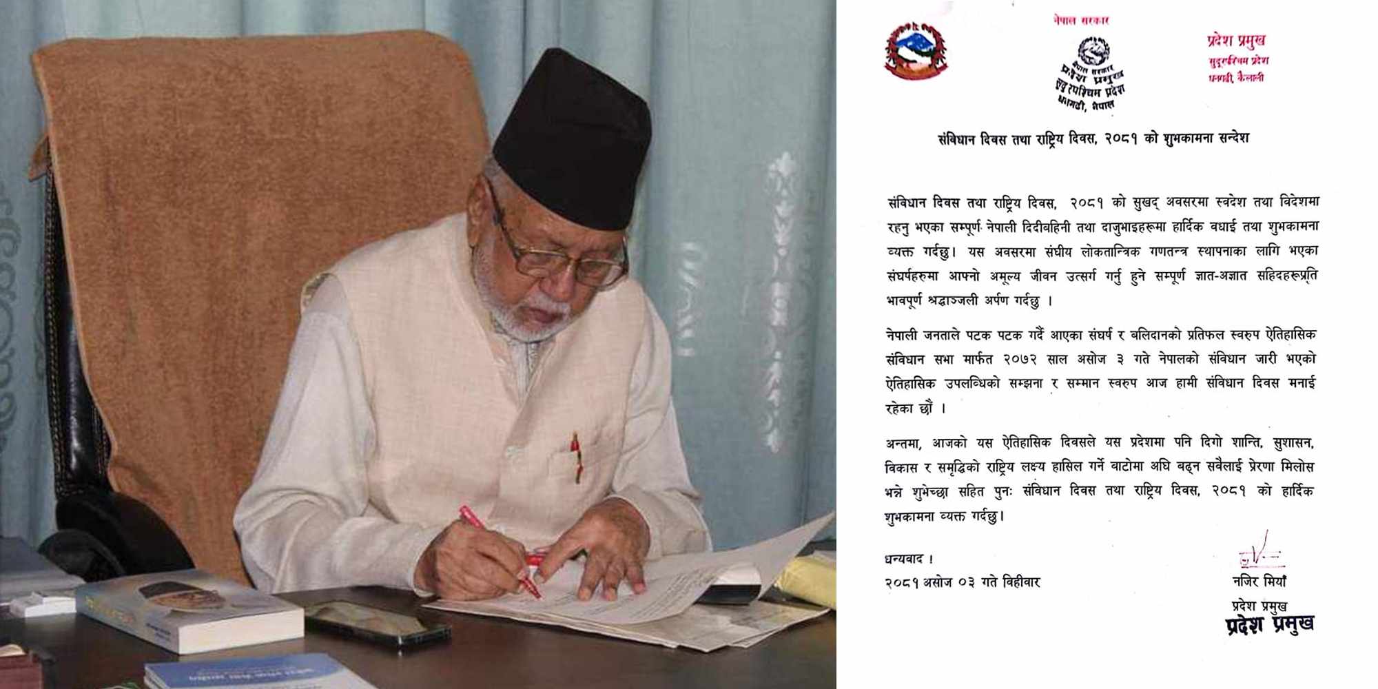‘नेपाली जनताले पटक पटक गर्दै आएको सङ्घर्ष र बलिदानको प्रतिफल स्वरूप ऐतिहासिक संविधानसभा मार्फत २०७२ साल असोज ३ गते नेपालको संविधान जारी भएको ऐतिहासिक उपलब्धिको सम्झना र सम्मान स्वरूप आज हामी संविधान दिवस मनाइरहेका छौँ’ प्रदेश प्रमुख मियाँले जारी गरेको शुभकामना सन्देशमा उल्लेख गरिएको छ ।