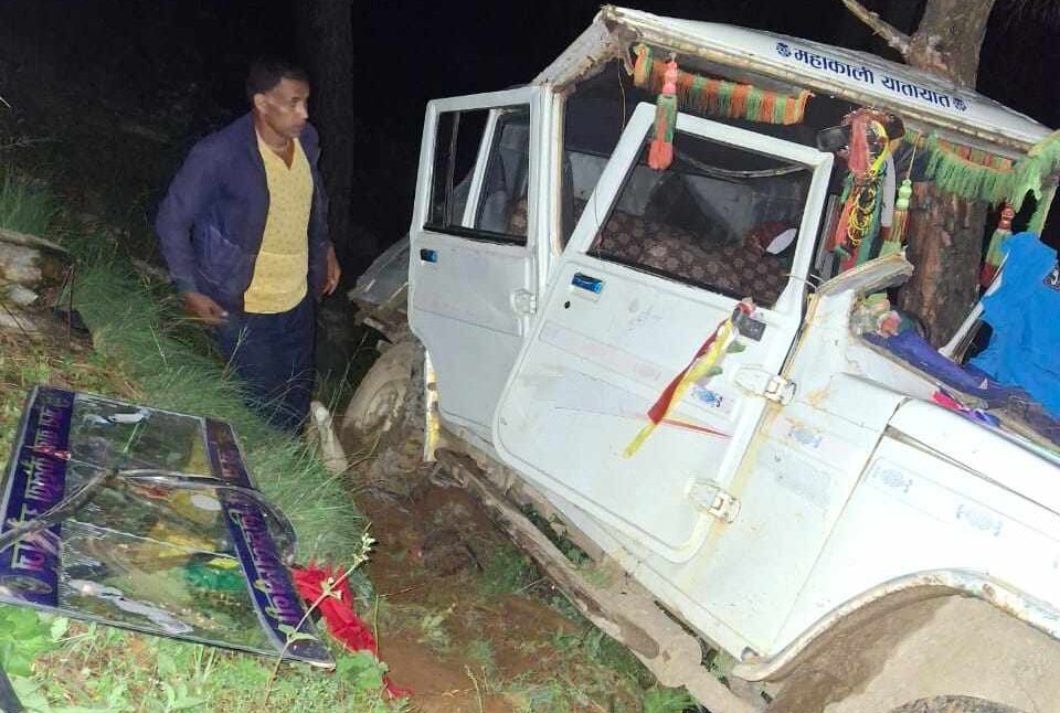 दुर्घटनामा परेर चालकसहित छ जना घाइते बैतडीका प्रहरी प्रवक्ता,प्रहरी निरीक्षक जनकराज ढुंगानाले जानकारी दिनुभयाे । घाइते हुनेहरूमा दशरथचन्द नगरपालिका ३ का ४५ वर्षीय दिलिप नाथ, साेहि ठाउँका ३९ वर्षीय भानदेव नाथ, ४० वर्षीया अनिता नाथ, ४६ वर्षीय केशव नाथ,१६ वर्षीय सुशील नाथ र जीप चालक दशरथ नाथ रहेका छन् ।