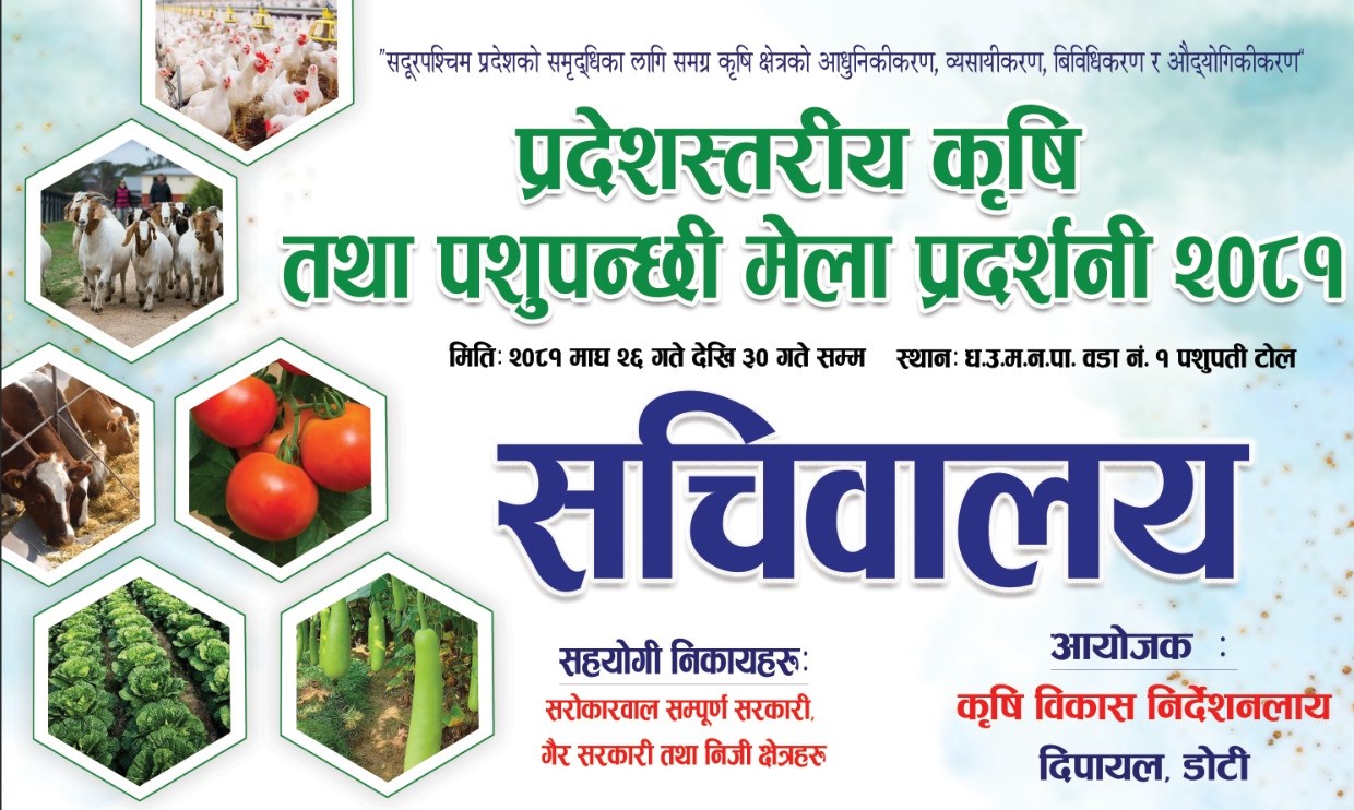 धनगढी- सुदूरपश्चिम प्रदेश सरकारले प्रदेशमा पहिलो पटक प्रदेश स्तरीय कृषि तथा पशुपन्छी मेला प्रदर्शनी गर्ने भएको छ । यही माघ २६ गते देखि ३० गते सम्म धनगढी उपमहानगरपालिका वडा नम्बर १ मा रहेको खुला मैदानमा मेला सञ्चालन हुने भएको हो ।