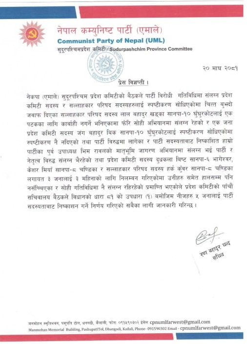 केही दिन अघि बसेको सचिवालय बैठकले उनिहरुलाई पार्टी गतिविधि लागेको भन्दै निष्कासन गरेको पार्टी प्रदेश सचिव रण बहादुर चन्दले जारी गरेको प्रेस विज्ञप्तिमा उल्लेख गरिएको छ ।