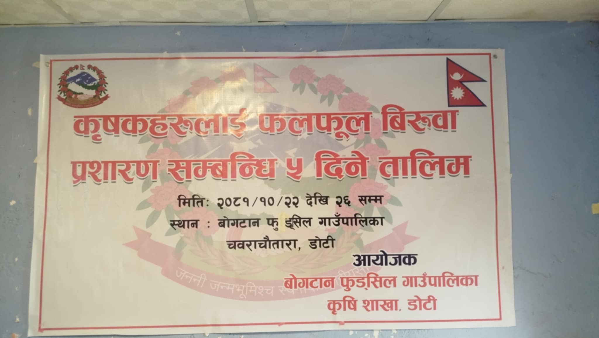 डोटी- डोटीको बोगटान फुड्सिल गाउँपालिकामा कृषकहरूलाई फलफूल बिरुवा प्रसारण सम्बन्धी पाँच दिने तालिम सुरु भएको छ । बोगटान फुड्सिल गाउँपालिका कृषि शाखाले आयोजना गरेको तालिमको मङ्गलवार एक कार्यक्रमका बिच गाउँपालिका अध्यक्ष कमल बहादुर गड्सिलाले उद्घाटन गरेका हुन् ।