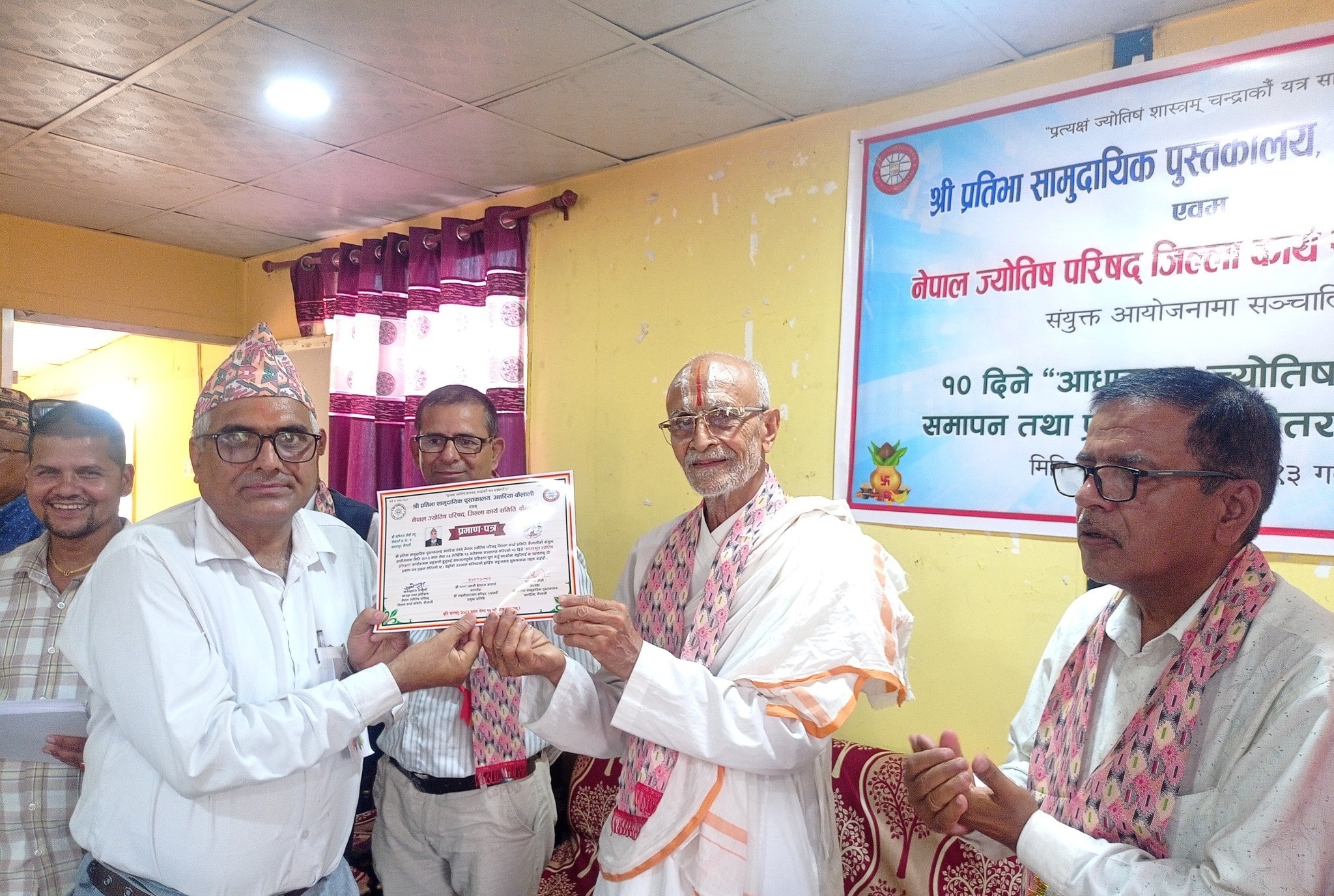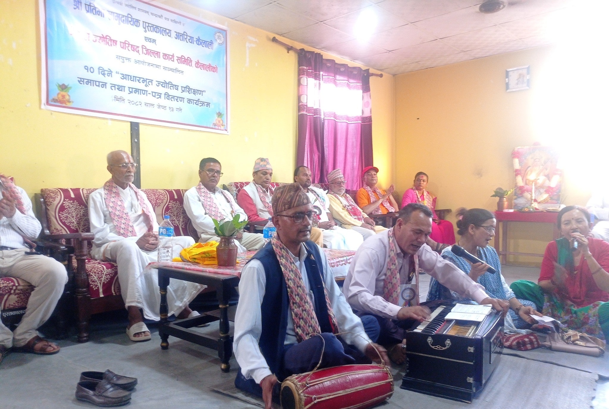 अत्तरिया- नेपाल ज्योतिष परिषद्, जिल्ला कार्य समिति कैलाली र अत्तरिया स्थित श्री प्रतिभा सामुदायिक पुस्तकालयको संयुक्त आयोजनामा सञ्चालित निःशुल्क आधारभूत ज्योतिष प्रशिक्षण कार्यक्रम मंगलबार एक कार्यक्रमका बिच सम्पन्न गरिएको छ।