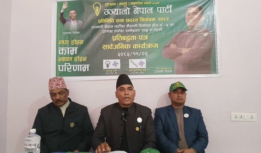 धनगढी- कैलाली निर्वाचन क्षेत्र नं. ५ बाट प्रतिनिधि सभा सदस्य पदका उम्मेदवार चन्द्र साउदले आफ्नो विस्तृत प्रतिबद्धता–पत्र सार्वजनिक गर्दै औपचारिक रूपमा चुनावी अभियान सुरु गरेका छन्। उज्यालो नेपाल पार्टीका तर्फबाट उम्मेदवारी दिएका साउदले पार्टीका नेतृत्वकर्ता कुलमान घिसिङको नेतृत्वमा जनताको मुद्दा लिएर चुनावी मैदानमा उत्रिएको बताएका छन्।