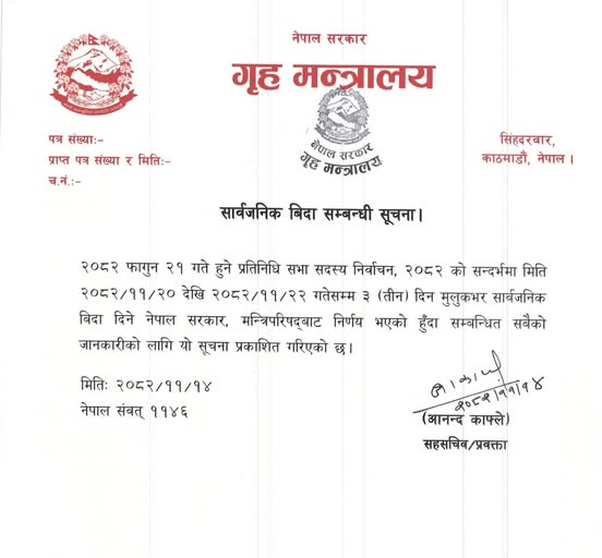 २१ फागुनमा हुने प्रतिनिधिसभाको निर्वाचनलाई मध्येनजर गर्दै गृह मन्त्रालयले तीन दिन सार्वजनिक बिदा दिएको छ ।