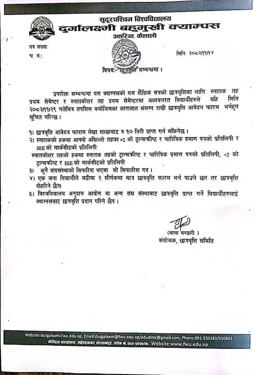 अत्तरिया- कैलालीको अत्तरियामा दुर्गालक्ष्मी बहुमुखी क्याम्पसले यस शैक्षिक सत्रका स्नातक तथा स्नातकोत्तर तह प्रथम सेमेष्टरमा अध्ययनरत विद्यार्थीहरूका लागि छात्रवृत्ति आवेदन खुलाएको छ । क्याम्पसले आज (बिहीबार) एक सूचना जारी गर्दै आवेदन बुझाउने अन्तिम मिति २०८२ फागुन २९ गतेसम्मलाई तोकिएको छ ।