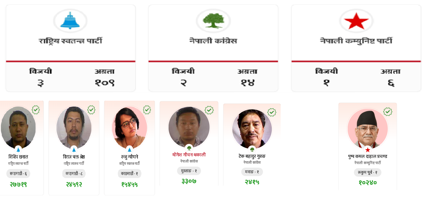 नतिजा घोषणा भएका ६ क्षेत्र मध्ये राष्ट्रिय स्वतन्त्र पार्टीले तीन वटा, नेपाली कांग्रेसले दुई वटा र नेपाली कम्युनिस्ट पार्टीले एउटा क्षेत्रमा जित हासिल गरेका छन् ।