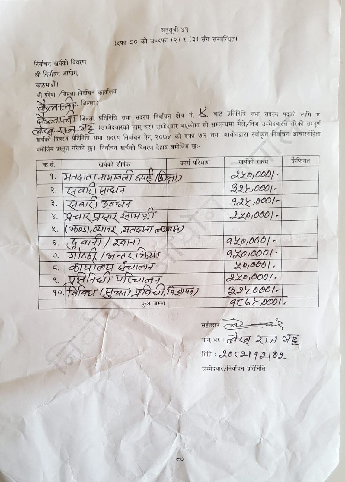 अत्तरिया- प्रतिनिधिसभा सदस्य निर्वाचन क्षेत्र नम्बर ४ कैलालीका उम्मेदवार लेखराज भट्टले निर्वाचन खर्च विवरण सार्वजनिक गरेका छन्। भट्टले निर्वाचन आयोगमा बुझाएको विवरणअनुसार उनले चुनावी अभियानमा कुल १८ लाख ७५ हजार रुपैयाँ खर्च गरेका छन्।