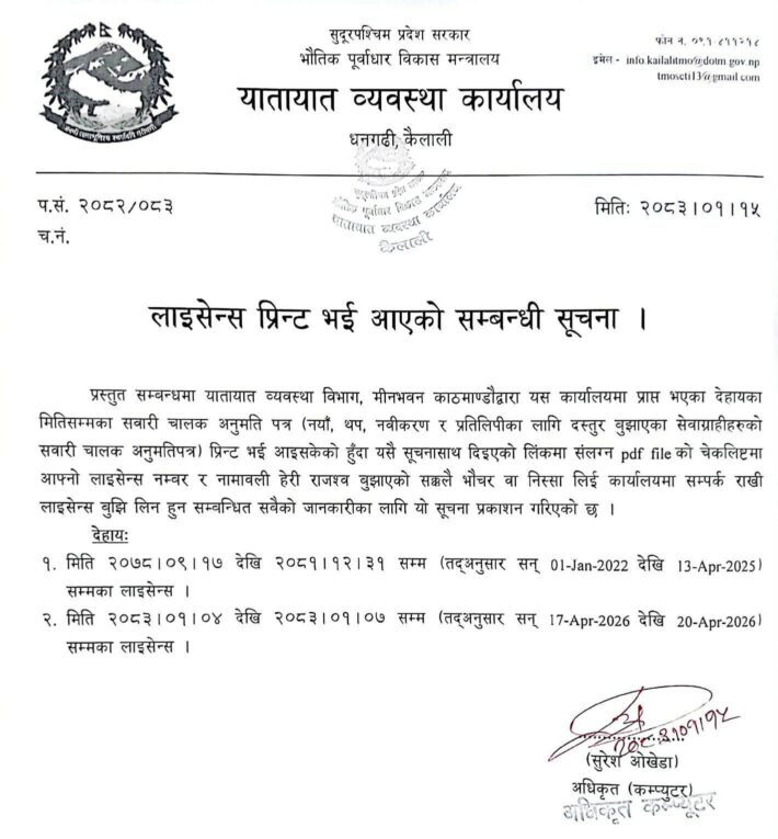 हुलाकमार्फत धनगढी पठाइएकोमा यो अवधिमा नयाँ, थप नवीकरण र प्रतिलिपीका लागि दस्तुर बुझाएका सेवाग्राहीका लाइसेन्स रहेको यातायात कार्यालयले जनाएको छ ।